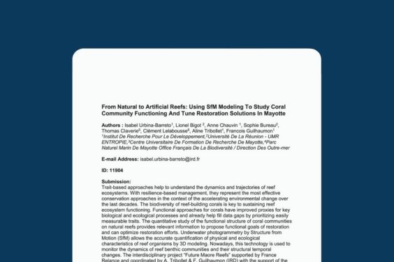 Présentation d’Isabel Urbina Barreto à Wiomsa, 12ème édition: « From natural to artificial reefs, using SfM modeling to study coral community functionning and tune restoration solutions in Mayotte »